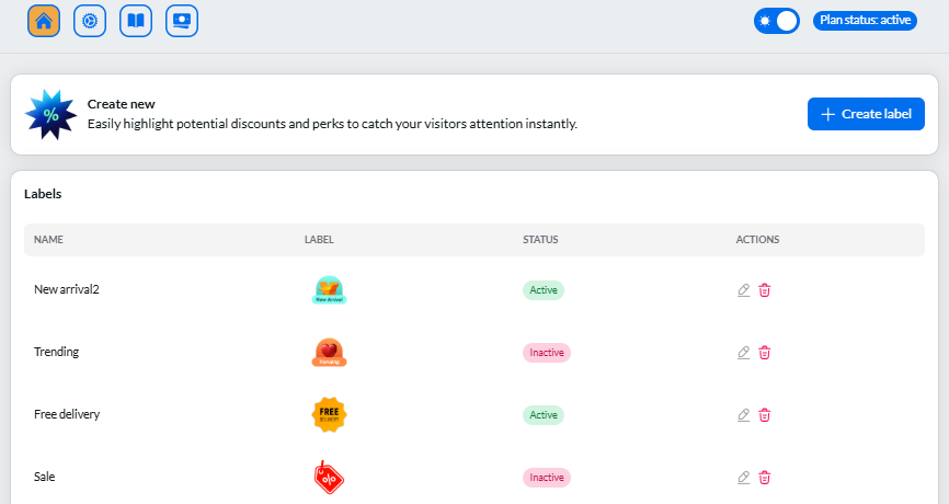 Here, you can create, edit, and delete your labels, as well as view their status (active, inactive, or scheduled).
