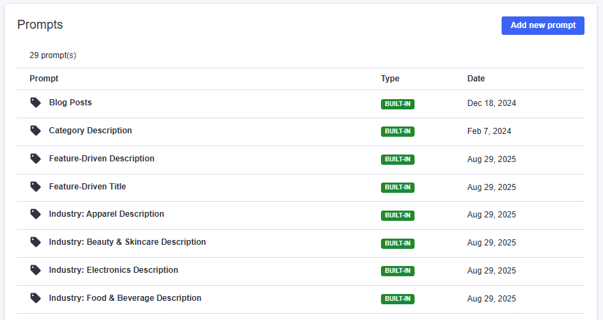 When using a custom prompt, make sure to use the global.input variable. You can find and copy it by going to Prompts > Add new prompt in the app’s admin panel. This step ensures that ChatGPT accesses information about your product from your product settings. If you're looking for ideas for custom prompts, check out our blog post.
