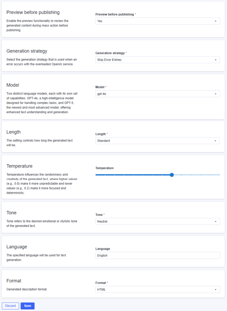 These general settings determine how content is generated, whether for a single item or in bulk. If you need different settings for a specific product, category, or blog post, you can adjust them individually.