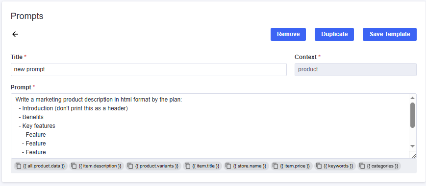 Be sure to include any of these variables in your prompt, the system automatically pulls the corresponding, most up-to-date data from your store to automatically insert into your generated content.
