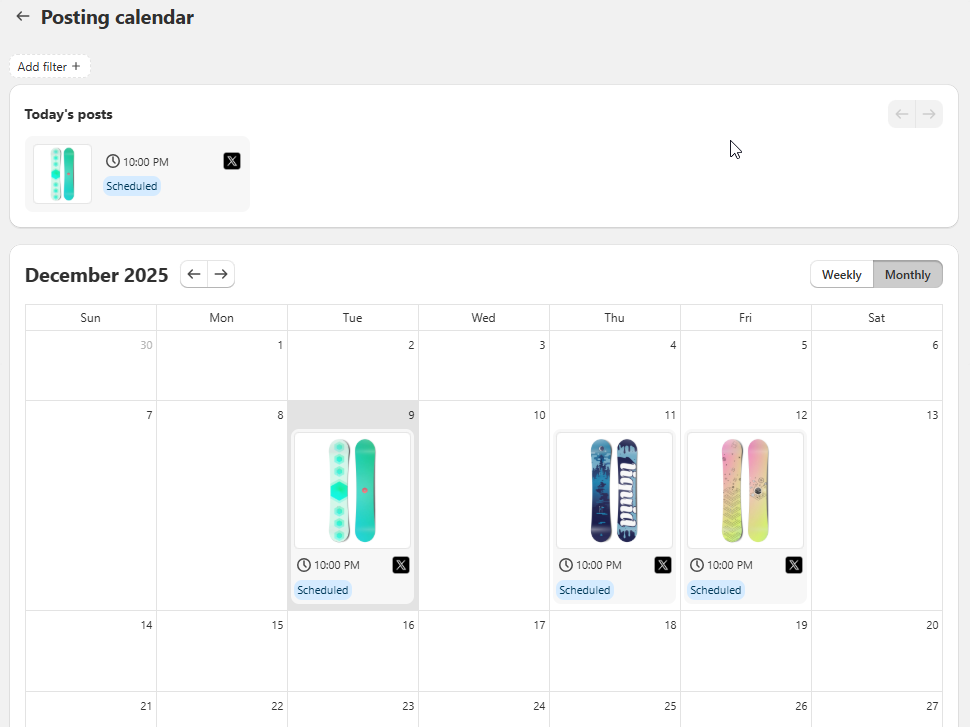- Monthly/Weekly Calendar – displays upcoming and past posts in weekly or monthly format.