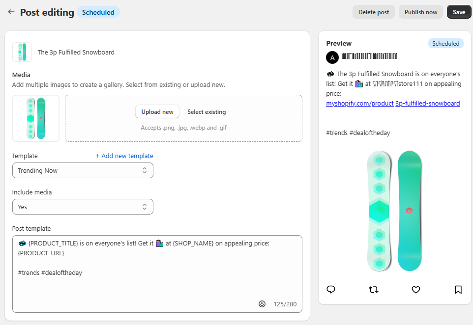 Include media (available for X, Facebook) - choose whether to include the product image in the post. You can preview the result in the section on the right.