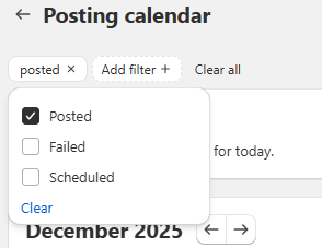 The Posting Calendar helps you view, edit, and manage your scheduled, published, and failed posts across all your social media platforms.
