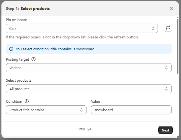 Note: Available only for condition-based selections: specifically "Any product" or "Product title contains", not for other conditions and selection methods. - Low stock - posts when a product's inventory drops to a specific quantity. You’ll need to specify the quantity (required field).