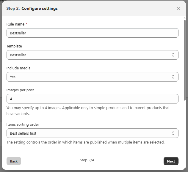 Images per Post - This setting allows you to automatically create posts featuring a gallery of images. Specify the maximum number of product images to include in a single post.