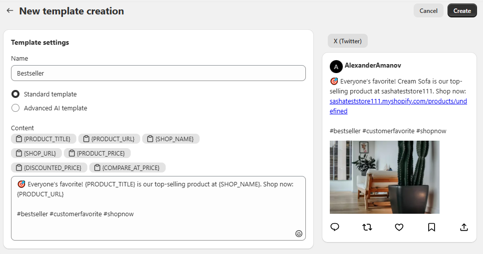 - Advanced AI template - a template created using variables and the text generated by AI for your posts.