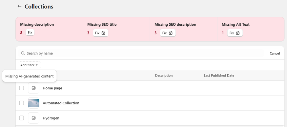 You can filter by Description, SEO Title, and SEO Description to view collections where these fields have not been generated and published by the application. This helps you quickly identify collections that need AI content generation.