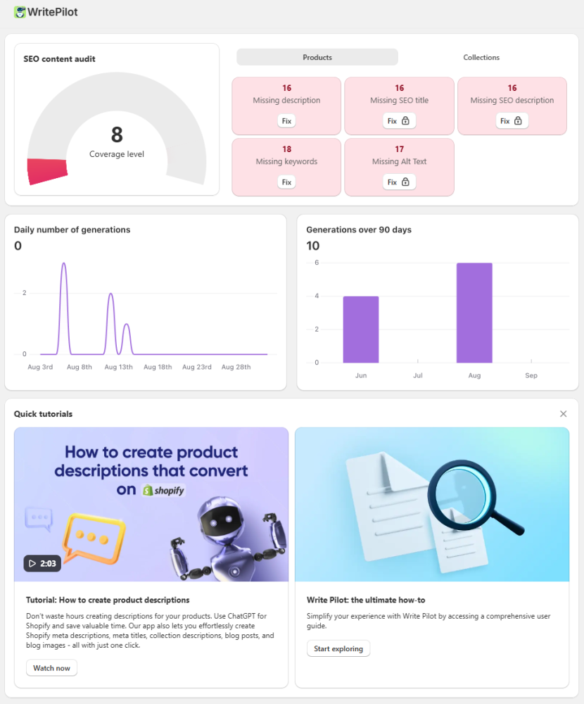 When you install WritePilot, you’ll arrive at the app’s Home page. Here, you’ll find a quick onboarding guide, a video tutorial on how to use the app, your subscription details, and the available credits for content generation.