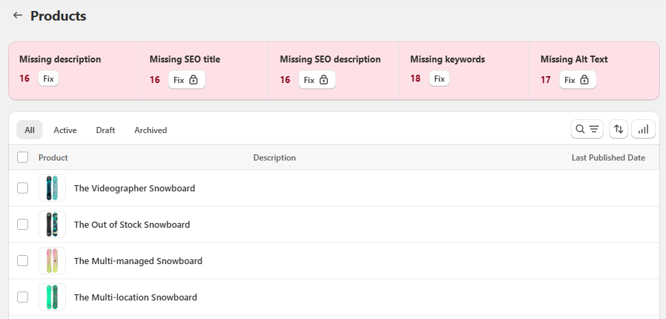 The grid provides sorting, searching, and filtering by product name, status or also by Missing AI-Generated Content. This search and filtering option helps you quickly identify products that are missing AI-generated content.