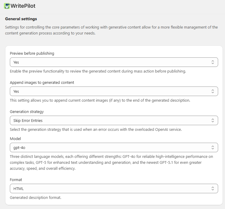 These settings are the basis for the content generation, both for individual content and multiple content through the 'Generate description'/'Generate SEO' mass action. However, it is important to note that these settings can be individually modified for specific object if custom adjustments are required.