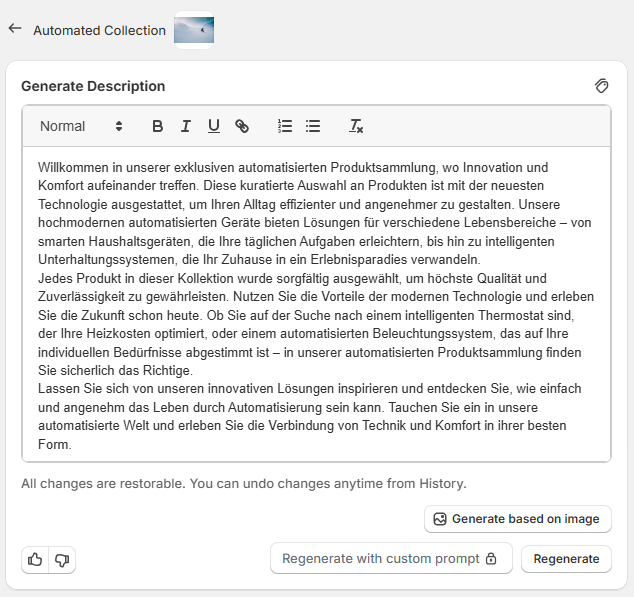 - Context – Generates using the product or collection title, description, and (if enabled) variants or keywords.