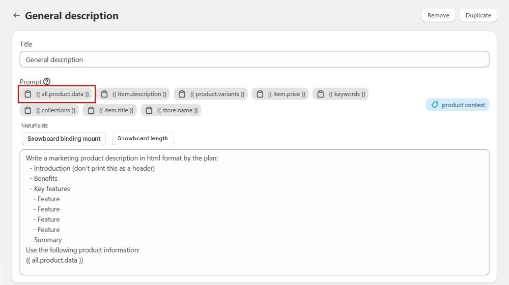 Depending on your goals, you can use the built-in templates or create custom ones. For example, you might want an SEO-friendly product description, a version tailored to a specific audience, or a description that combines both. Choose or customize prompts based on what fits your needs best.