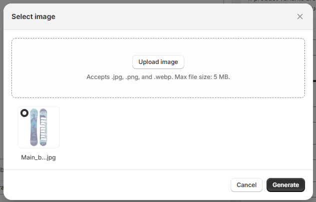 Note: Each image-based generation costs 5 credits. Supported image formats: .jpg, .webp, .png; Max file size: 5 MB. The image is used only for generation and is not published as part of the product description.