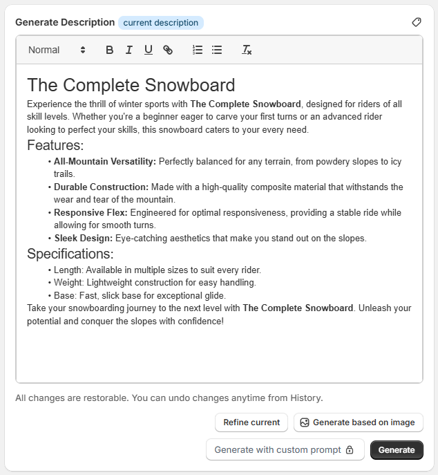 By using Metafields in your prompts, you are creating highly differentiated content. This results in "rich" descriptions that capture search intent for specific attributes (e.g., "stainless steel," "organic cotton," or "waterproof rating"), helping your products stand out to both customers and search engines.