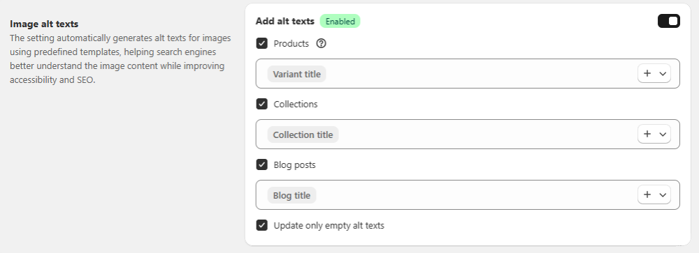 When you enable the Add alt texts toggle, you can customize templates for three specific areas of your store. Each category allows you to mix dynamic variables with your own custom text (e.g., adding "Buy " or "Official Store" around the variable):