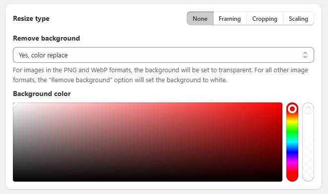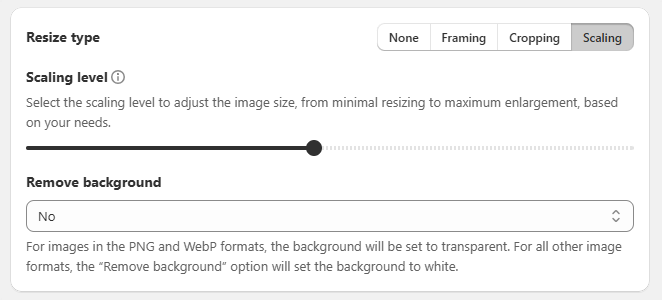 Configuration type - select Manual to unlock additional compression, conversion and resize options. With Shopify's default type, only Shopify's preferred compression, conversion and resize resolution are available.