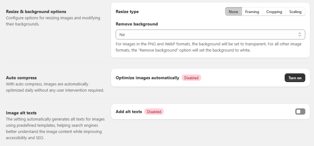 Specify your settings for compression, file format conversion, resize type, or enable automatic compression to optimize images daily based on your preferences. - Image optimization