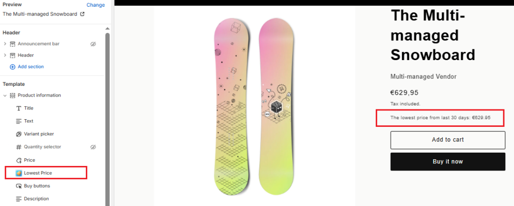 Arrange its placement using drag-and-drop, positioning it where you want to display the "Lowest price" (for example, under the main product price).