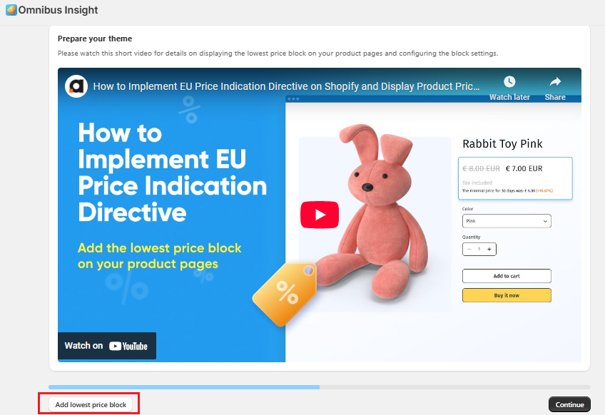 To add the “Lowest price” block to your theme, click the “Add Lowest Price Block” button during onboarding.