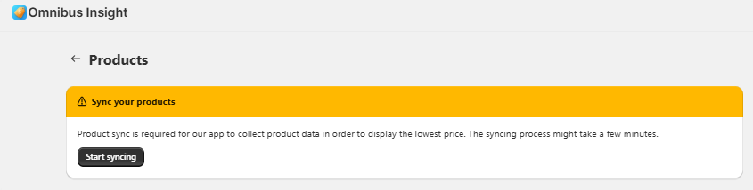 If you see a "Sync your products" notification, you’ll need to sync your products first. Syncing is essential for the app to gather product data and display the lowest price. Simply click the Start Syncing button to begin.