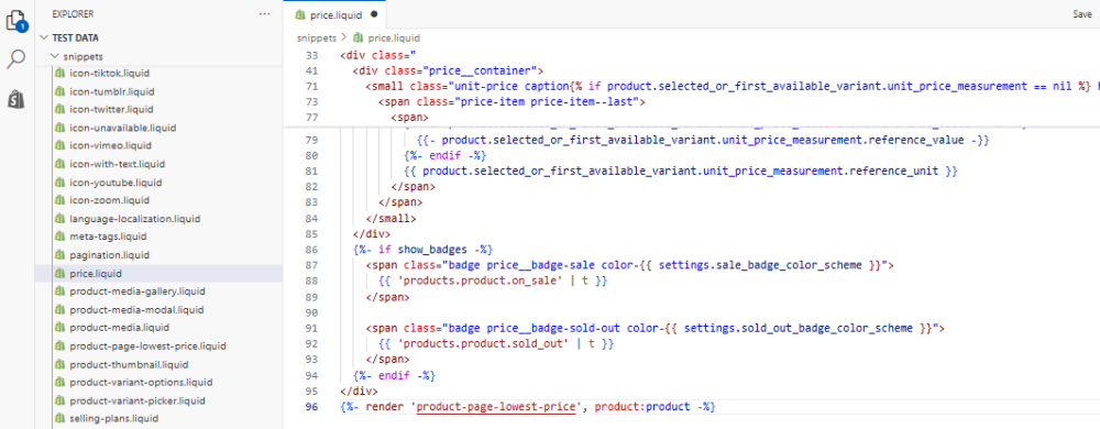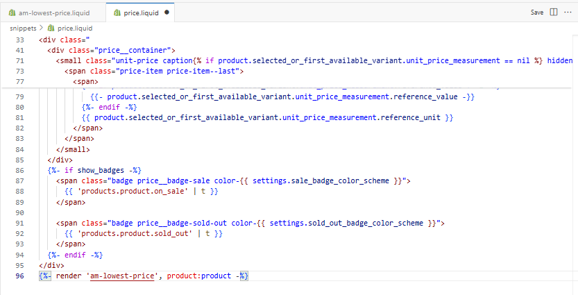 Note: Some third-party themes may use a different product variable name, which can cause the price.liquid code to not work. If you encounter this issue, try {%- render 'am-lowest-price', product:target -%}