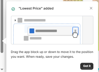 This will automatically take you to your theme's customization page and add the Lowest Price block to your product page template.