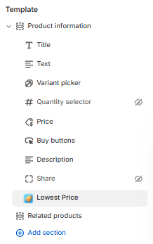 Once on the customization page, the Lowest Price block will be automatically added to the list of elements. Simply drag and drop the block to your preferred position on the product page (e.g., under the main price).