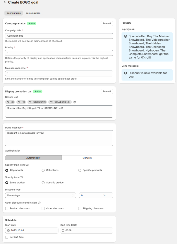 Schedule - set the start date and time for the promotion, and optionally specify an end date and time.