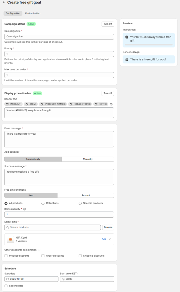 Items quantity (available for Item option) - define the quantity of each individual item that needs to be added to the order to qualify for a free gift.