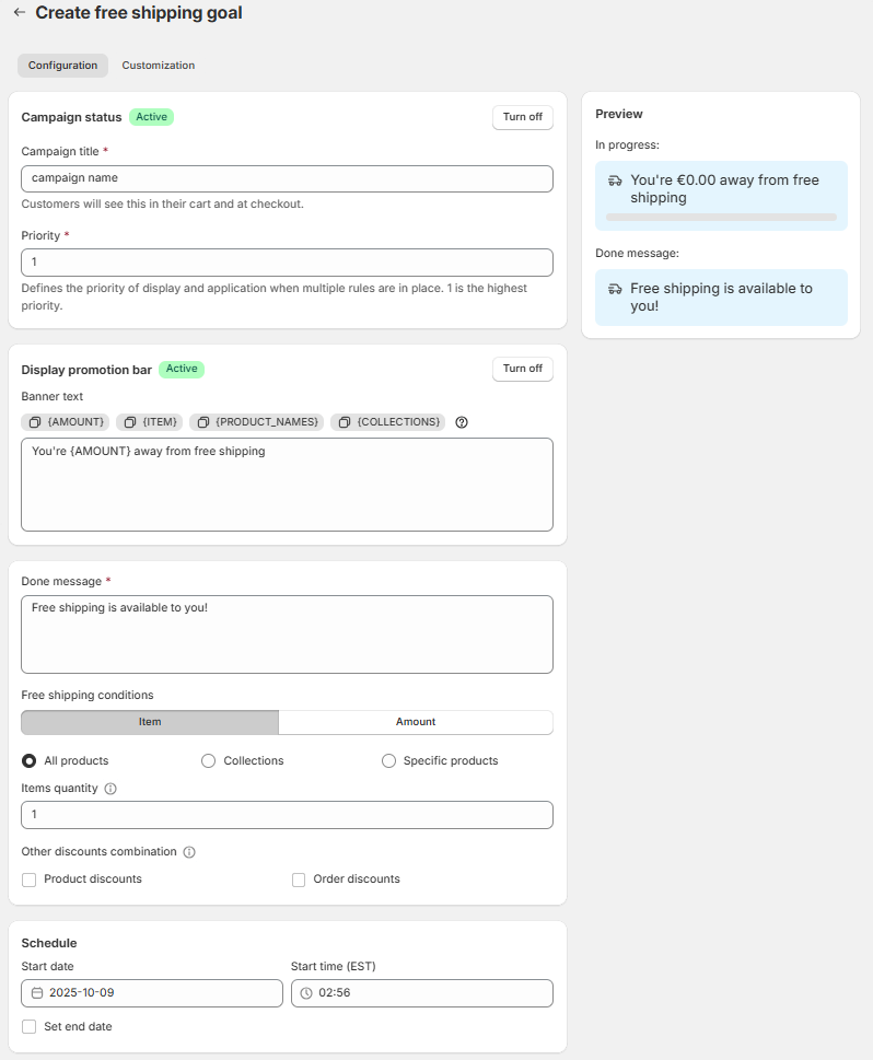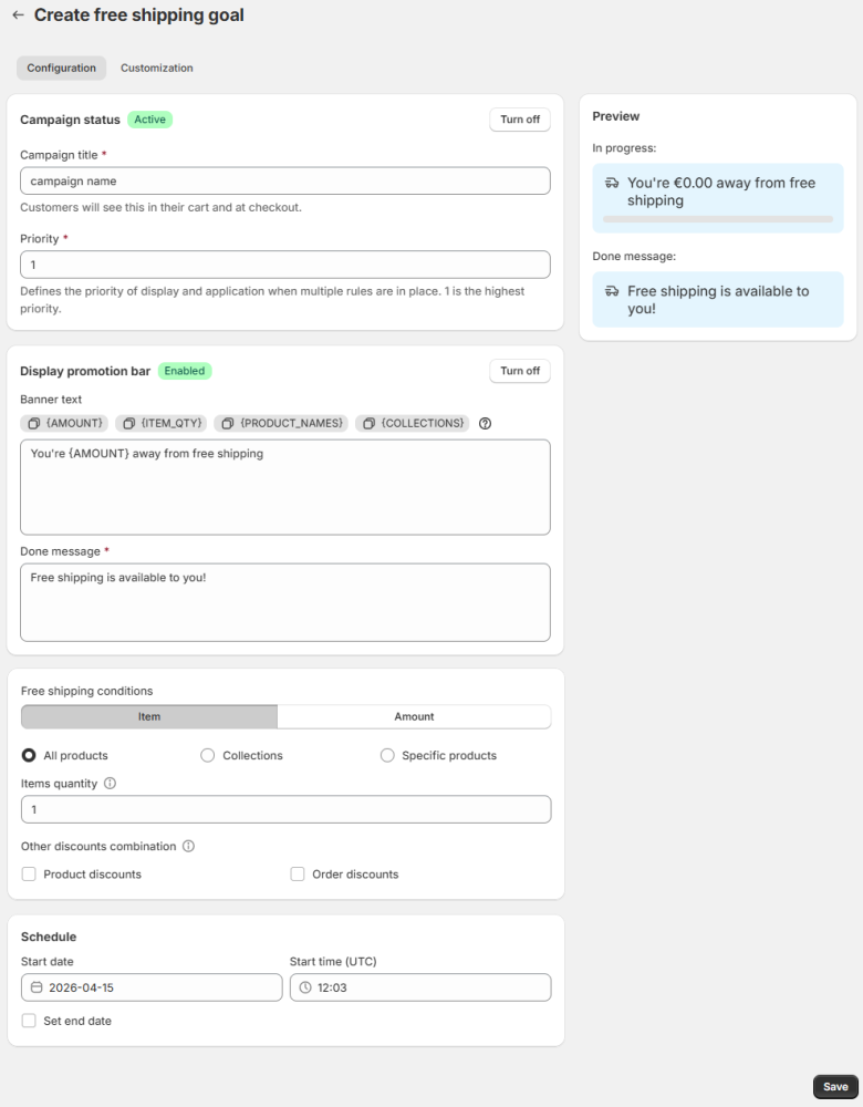 Banner text - adjust the text of your bar. Use the following variables in your messages to help customers understand what’s needed to reach the goal: