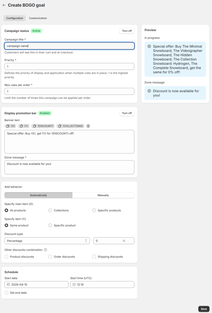 The Add behavior setting for Buy One, Get One (BOGO) rules determines how the discounted item is added to the customer's cart. This allows you to choose between automatic application and requiring the customer to take action.