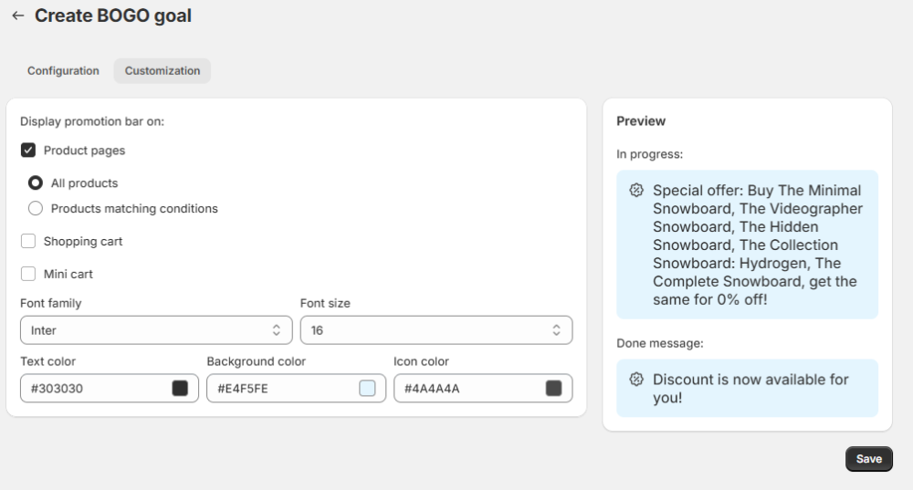 - Products matching conditions - show the bar only on product pages for items that trigger the BXGY deal.