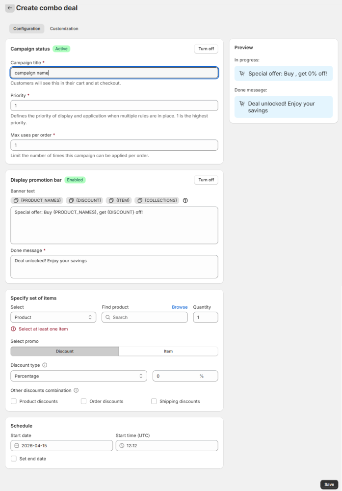 Display Promotion Bar - enabled by default. You can turn it off, and its status will update accordingly. The bar informs customers which combination of products or collections they need to purchase to unlock the offer, and what reward they will receive (discount or promo item). Once all conditions are met, the message automatically updates to confirm that the deal has been unlocked.