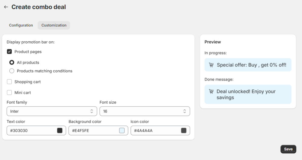 Behavior - If the promotion bar is enabled: Once the required set is completed, the bar text updates automatically, and a confirmation message is displayed in the cart and at checkout (using the Done message text). If the promotion bar is disabled: No bar is shown. Instead, a confirmation message appears in the cart and at checkout when the combo conditions are met (using the Done message text).