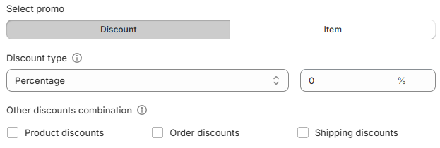 Other discounts combinations - choose whether this promotion can be combined with other types of discounts, such as product discounts (applied first to individual items) or order discounts (applied to revised subtotal), when applicable.