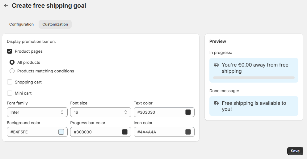 - Products matching conditions - show the bar only on product pages that contribute to the free shipping condition.