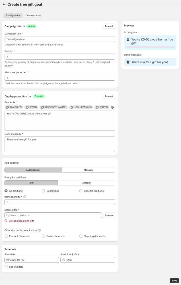 Select gifts - choose at least one product or variant to be given as a free gift with a purchase.