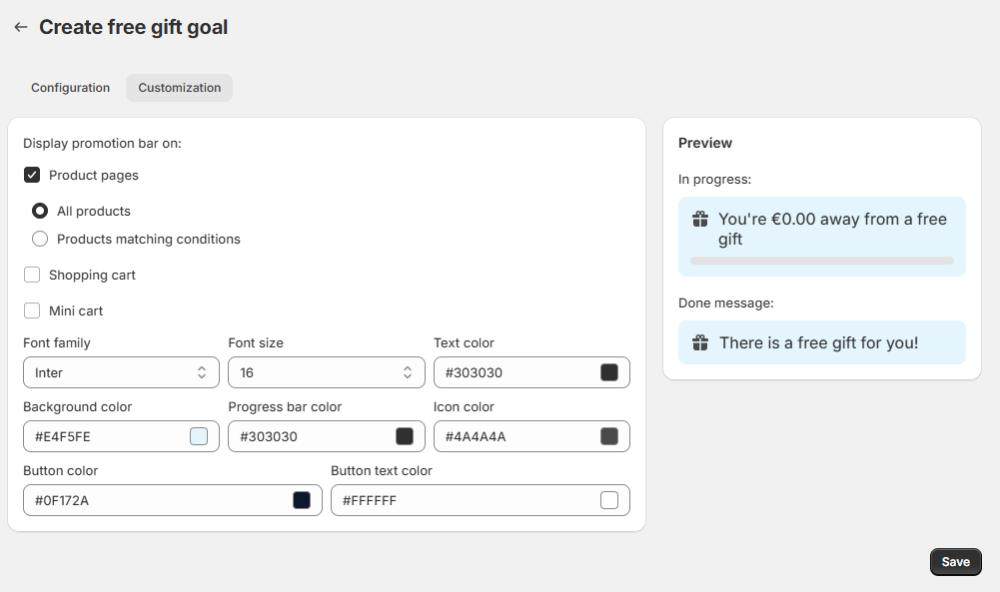 Return to the app and complete the second step in the onboarding to enable messages for customers when a free gift or free shipping is added at checkout.