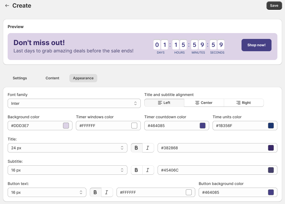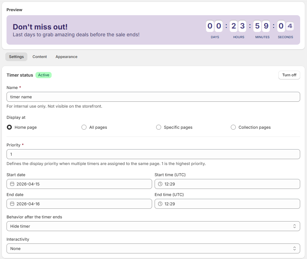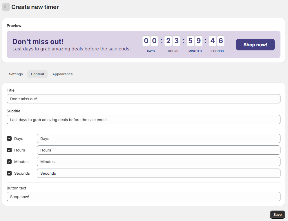Click Create timer to enter the configuration tabs: Settings, Content, Appearance.